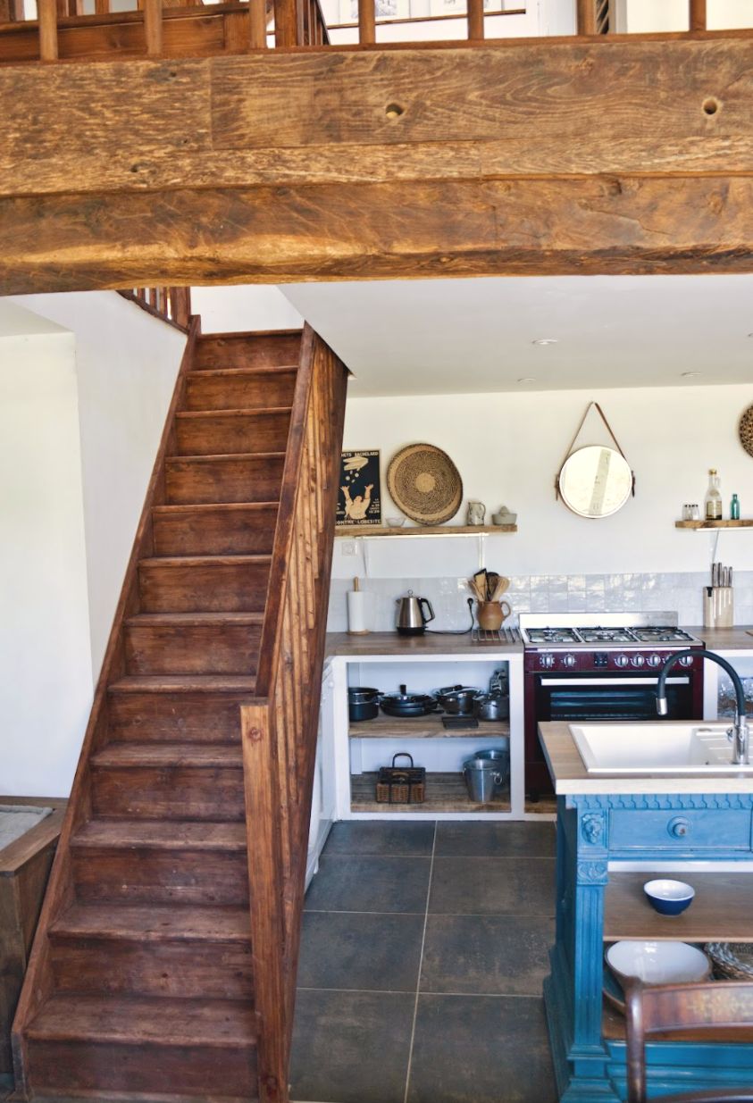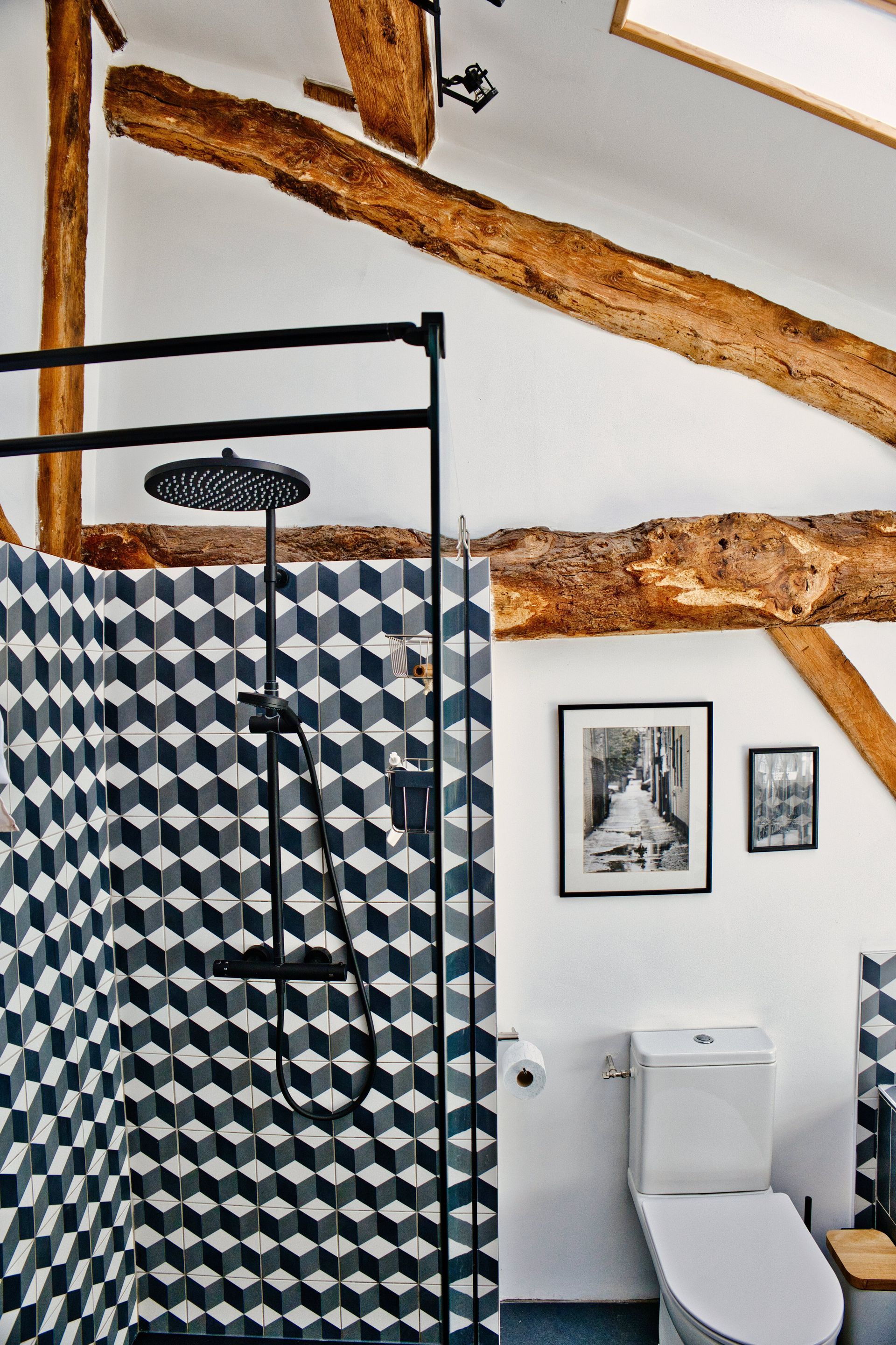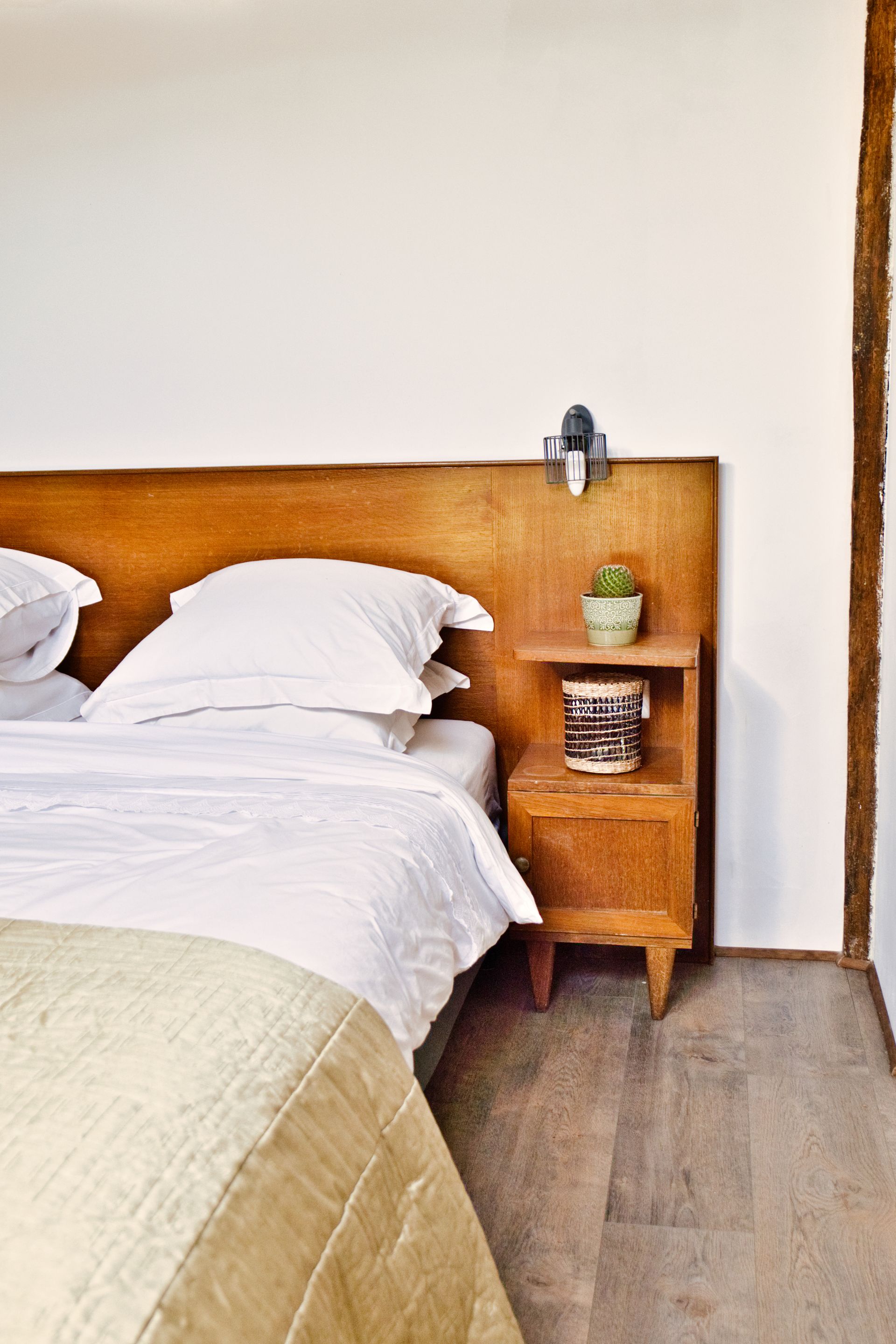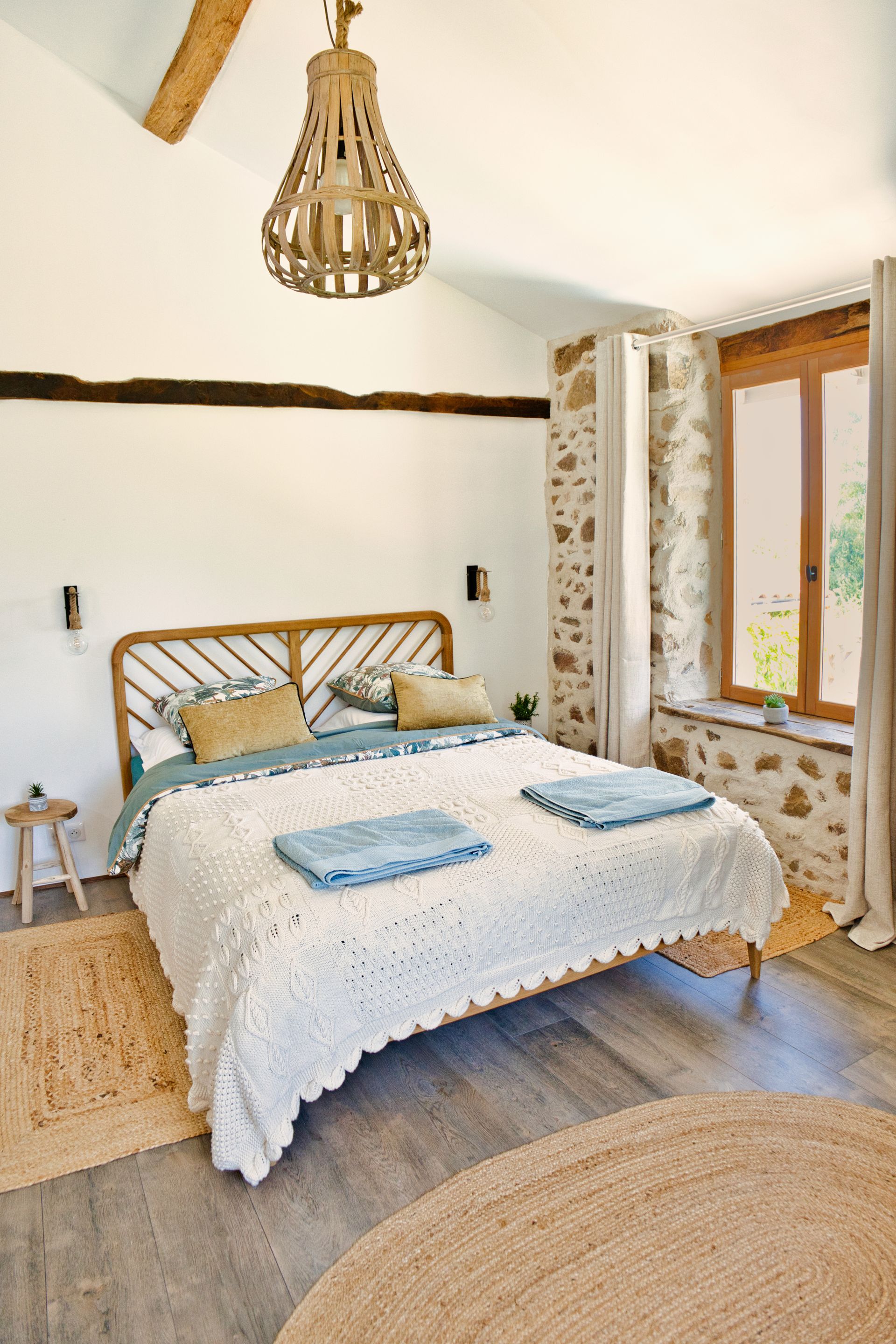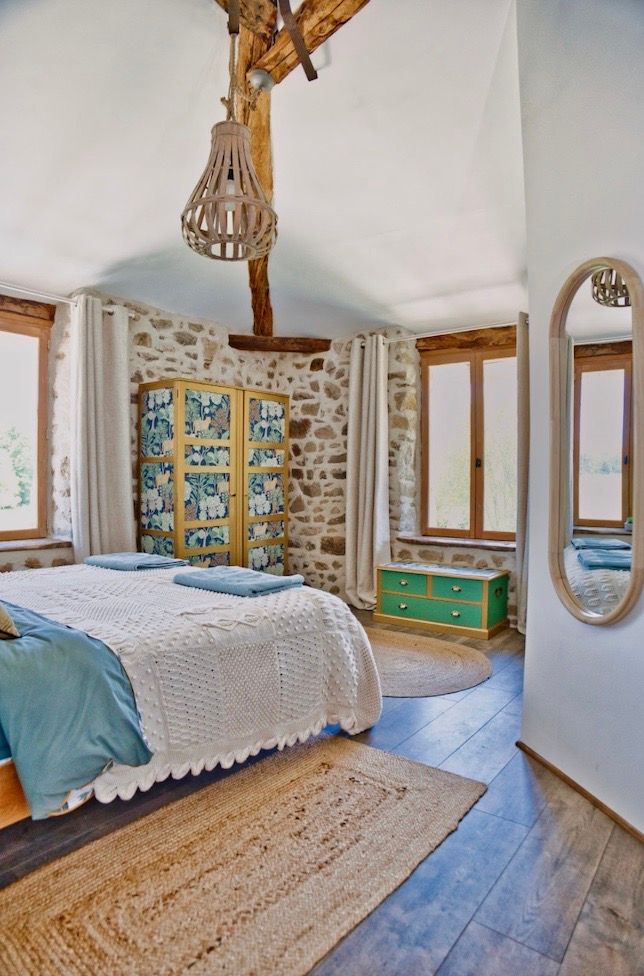 This dual aspect bedroom enjoys sunrise views over the gardens and swimming pool from the King Size bed (160cm). The stunning vaulted ceilings and beautifully curated bohemian furnishings make this a picture-perfect room. You'll also find everything you need for a comfortable stay; double wardrobe, chest of drawers, full length mirror and hairdryer. The tastefully designed en-suite has a shower, sink, loo and heated towel rail.